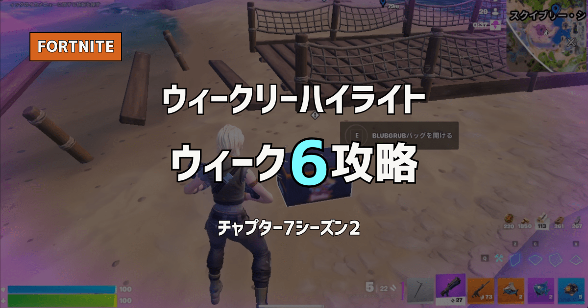 チャプター7シーズン2のウィークリークエスト、ウィーク3の攻略についてです。クリア報酬は1つクリアするごとに20000XPです。 名前付きのエリアで宝箱を開けて物資を回収する(10) マップを開いた時 ...