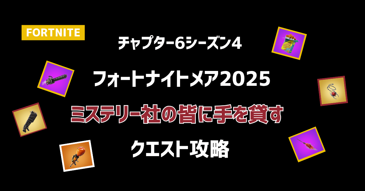 今回は2025年のフォートナイトメアのクエスト、ミステリー社の皆に手を貸すの攻略です。