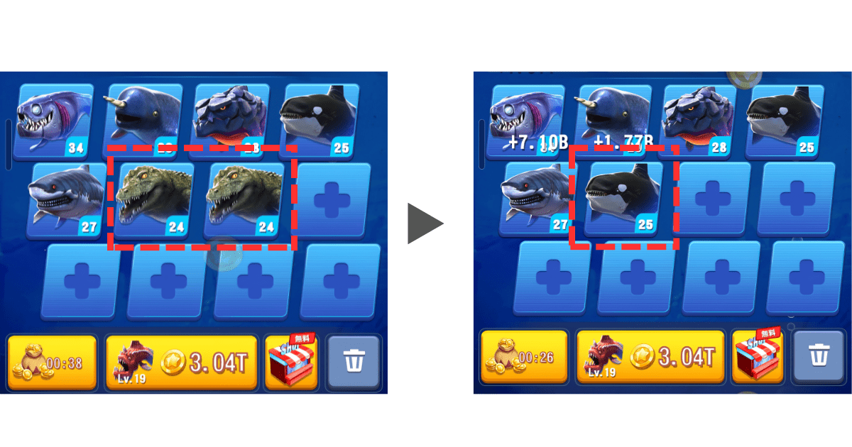 合成の枠が全部で12個しかないので、それ以下の魚がたくさんあるとレベルの高い魚の合成も難しくなってしまいます。