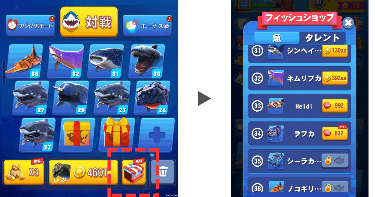 コインで魚を追加したい場合はショップから購入すると好きなレベルの魚が購入できますよ!