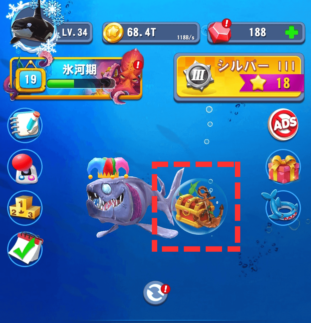 この宝箱をタップして広告視聴すると1秒に1匹魚をゲットすることができます。