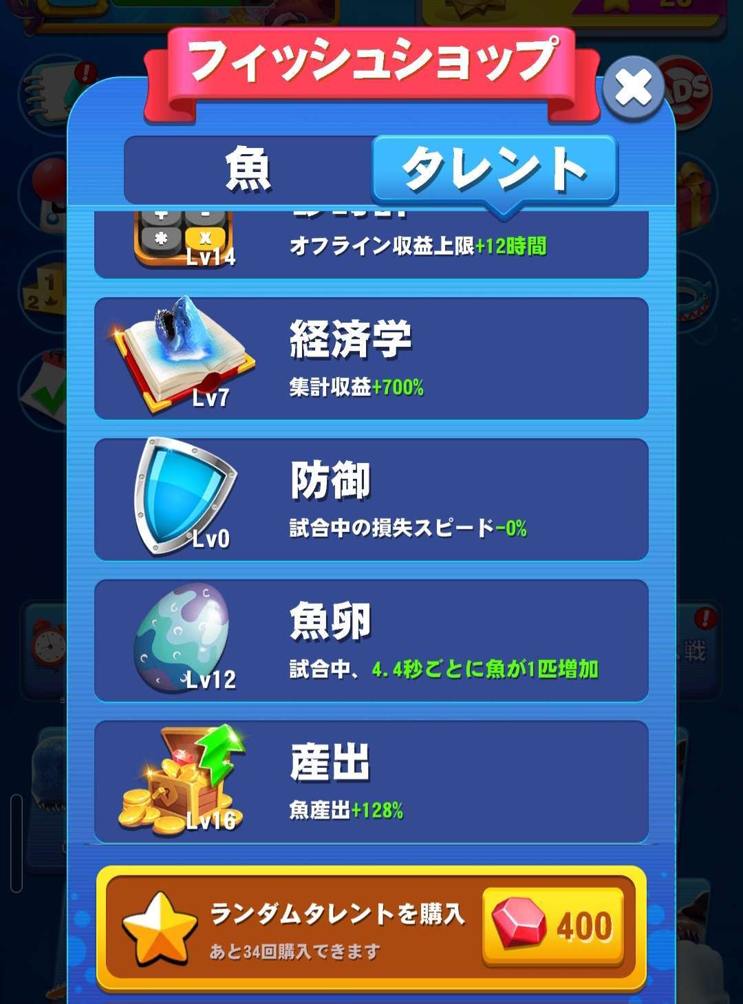 【フィッシュショップ】⇒【タレント】で能力をあげることができます。