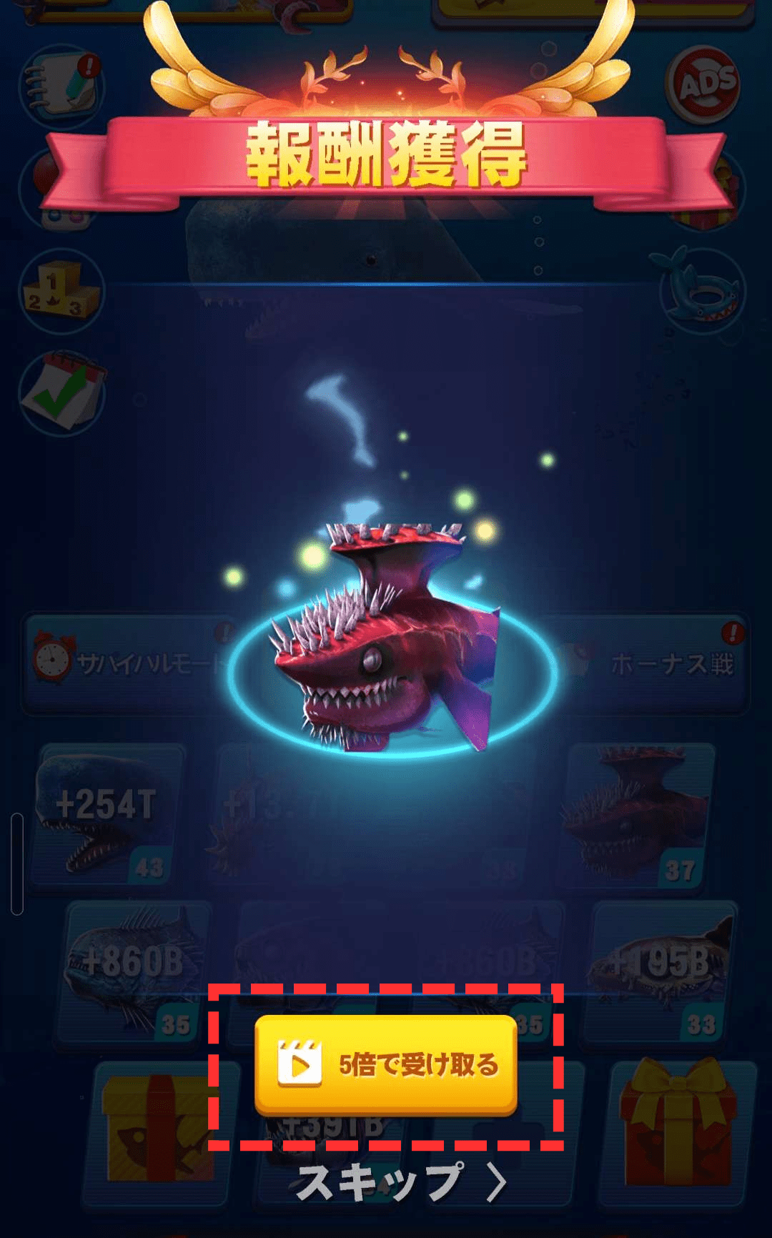 ちなみに報酬は4.39abがマックスです。(広告視聴で3倍になるので35のシーラカンスが買えます!)