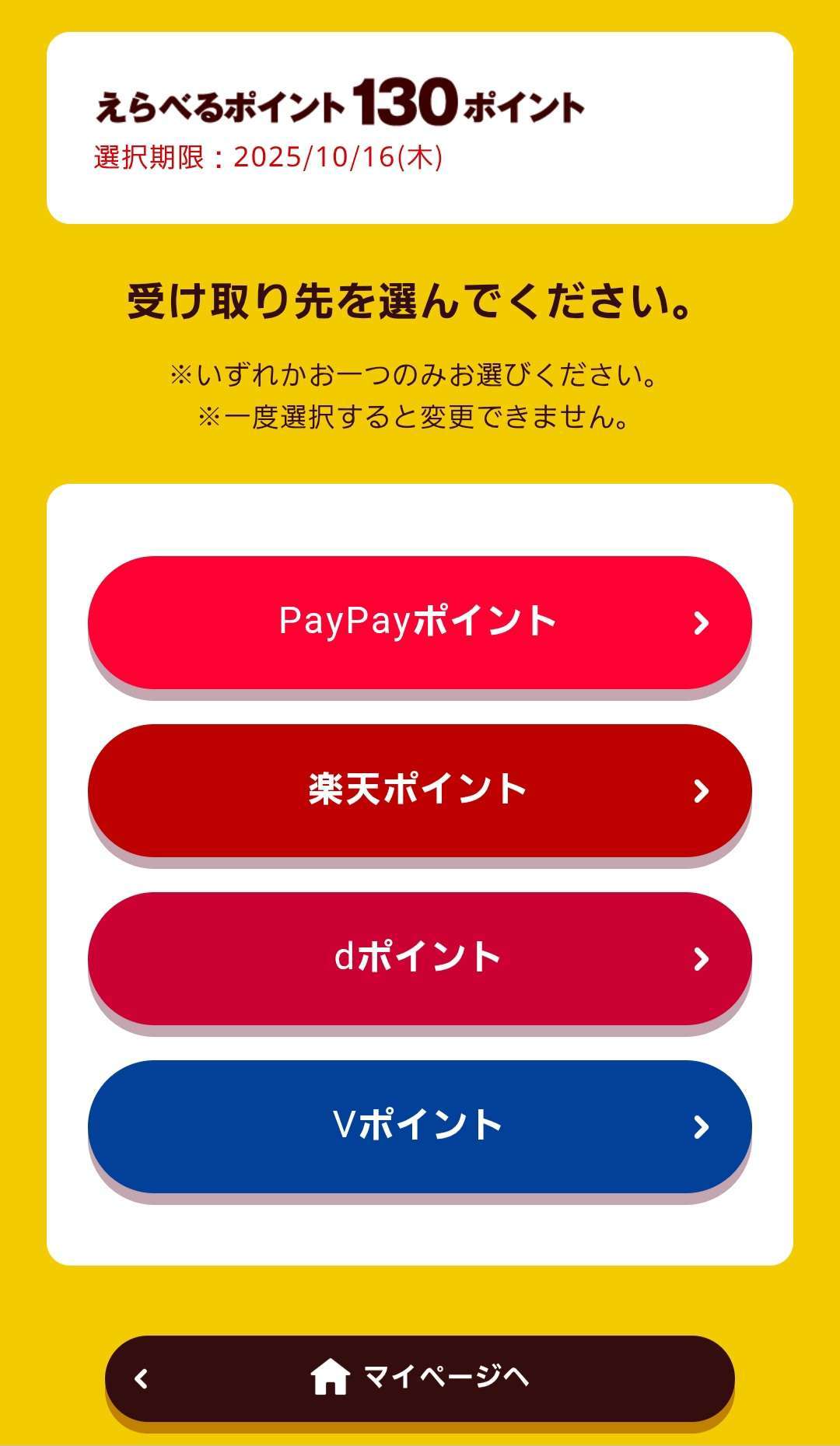 撮影したレシートを送って承認されると自分が好きなポイントの種類をどれか1つ選べます。