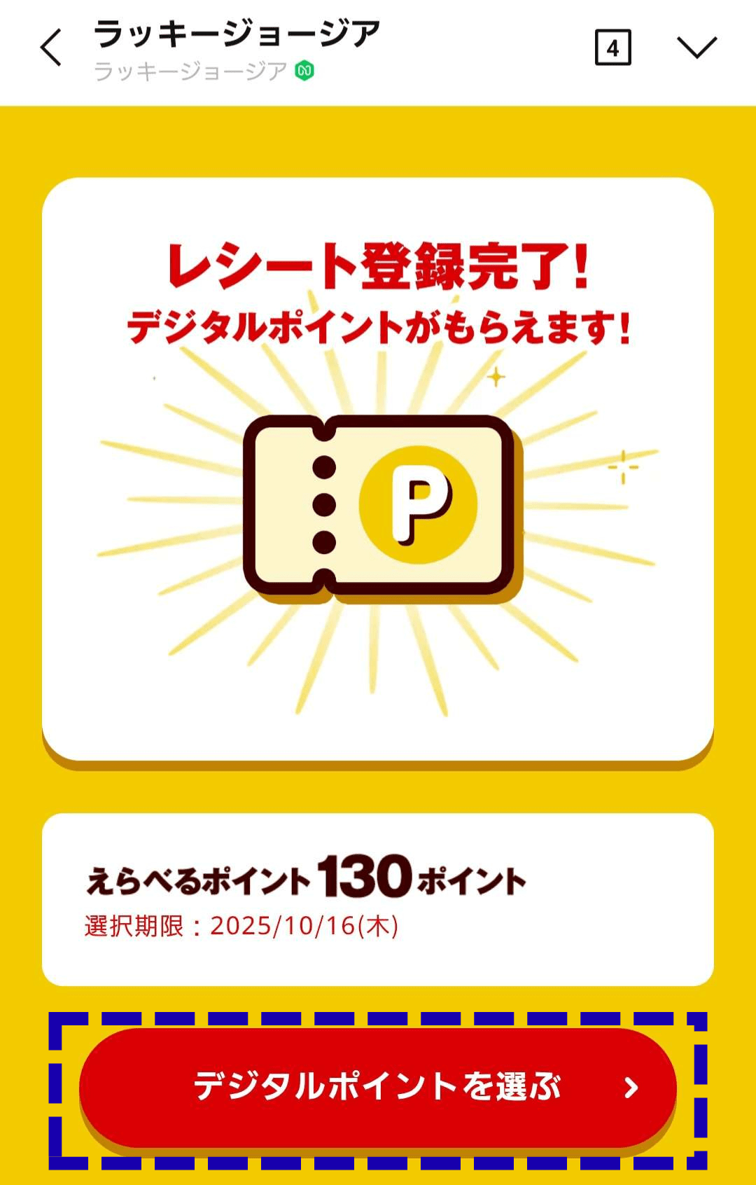 対象商品を購入して「ラッキージョージア」でレシートを読み取ると選べるポイントが130ポイントもらえるキャンペーンです。
