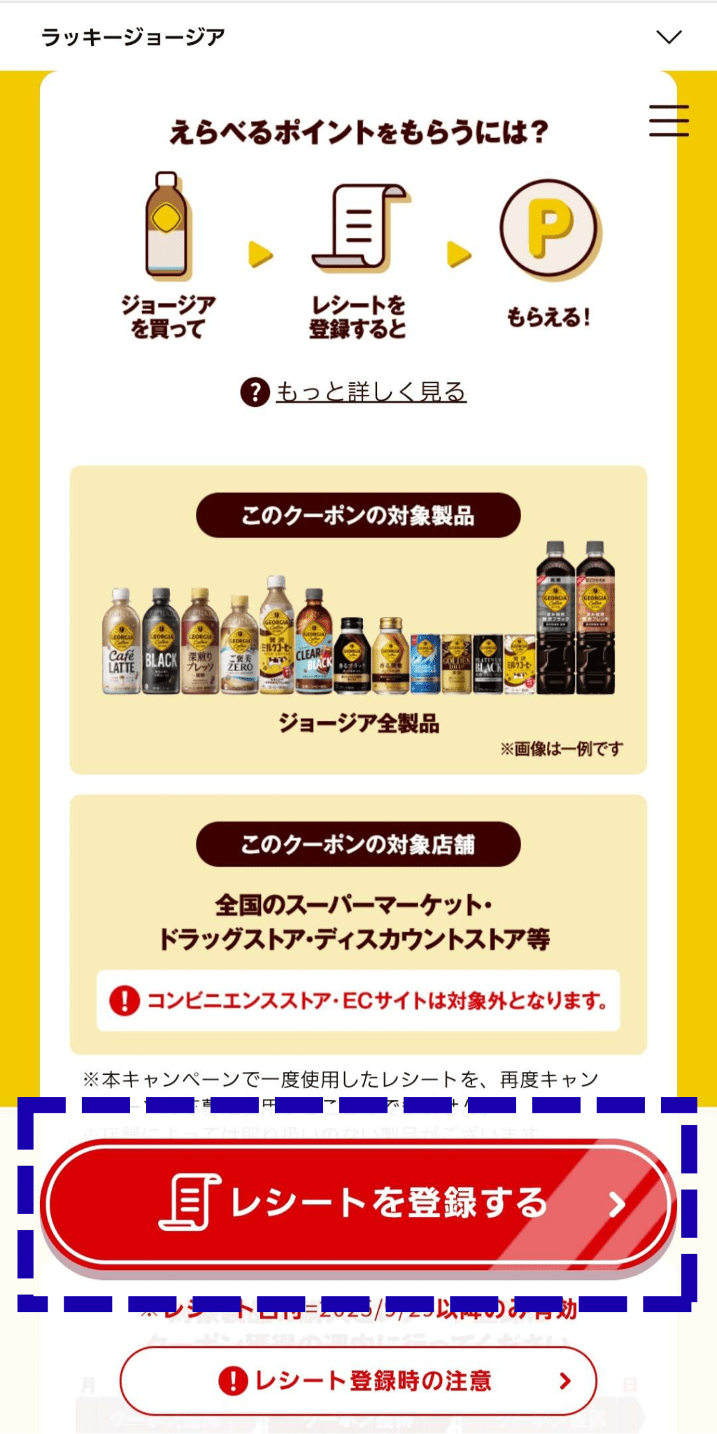レシートの写真を撮って、先ほどの【ジョージア公式】→【1本分実質無料クーポン】から【レシートを登録する】