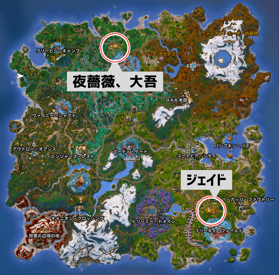 ジェイドはマップ右下の前哨基地、夜薔薇と大吾は左上の前哨基地にいるのでぞれぞれ話しかけます。