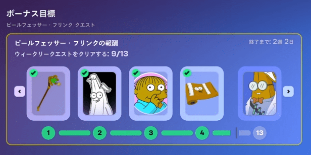 ウィーク1~4までのクエストを合計で13こクリアするとすべての報酬をゲットすることができます。