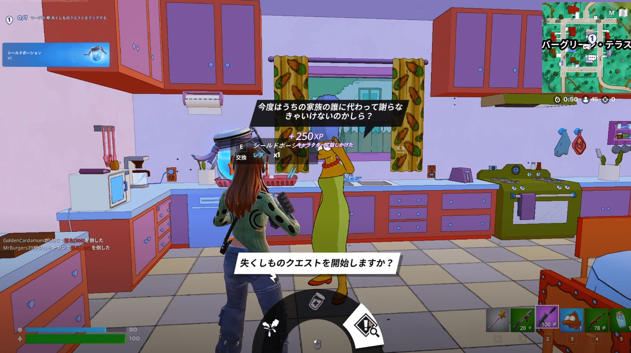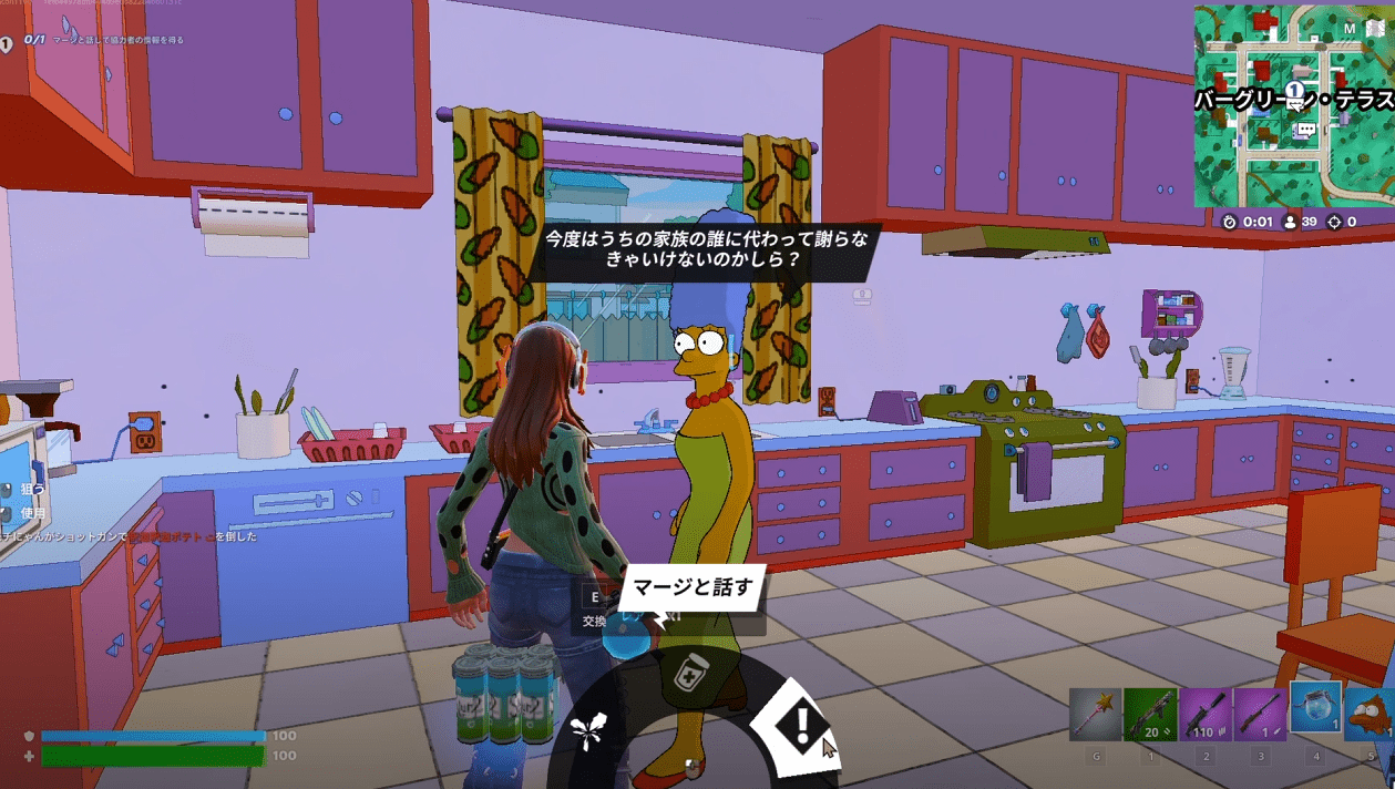 エバーグリーンテラスにいる【マージ・シンプソン】に話しかけて【失くしものクエスト】を開始します。
