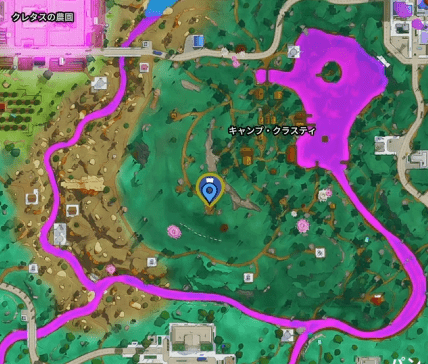 マップの真ん中あたり、キャンプクラスティ横の大きな山の上に行きます。