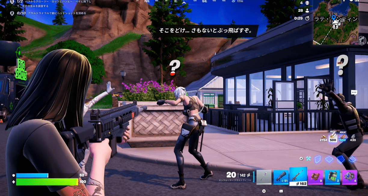 【アサルトライフルで敵にヘッドショットを決める】クエストと一緒に進めると効率がいいので、アサルトライフルを持ってボスの近くでしゃがみながら頭を狙うのがおすすめです。