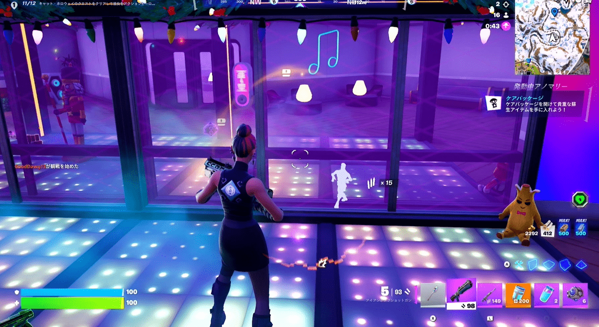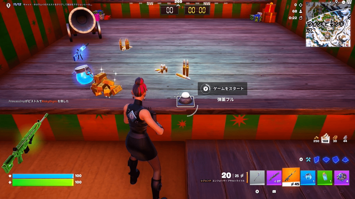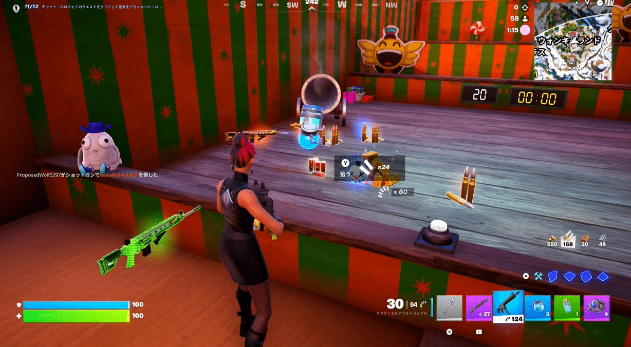 ウォンキーランドの真ん中あたりにある射的のミニゲームをして20点以上ポイントを獲得するとレジェンド(金)やエピック(紫)の武器やチャグジャグ、自己蘇生キットなどをゲットすることができるようです。