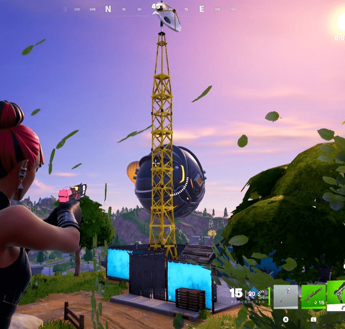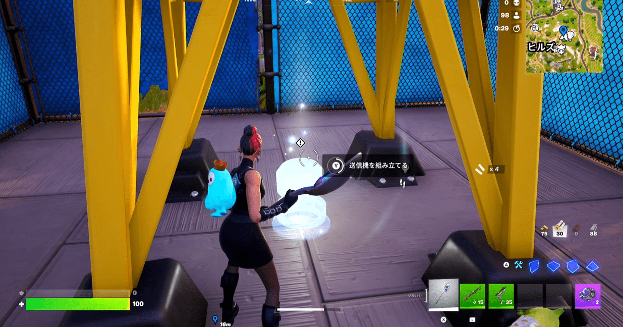 黄色の高い塔の下に行って【送信機を組み立てる】とクリアになります。