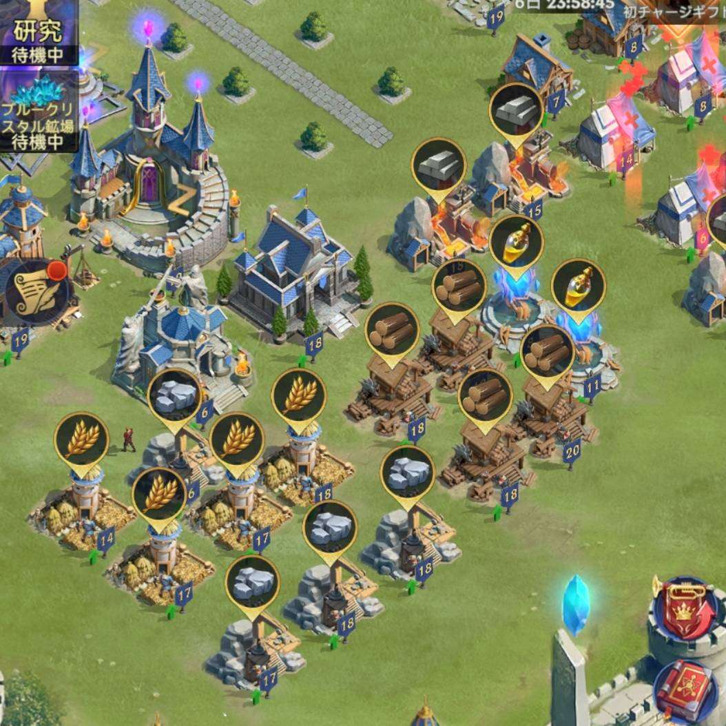 私はキャッスルレベル20までで、素材(食料、木材、石、鉄)の建物のレベルは平均17~18くらいまで上げました。