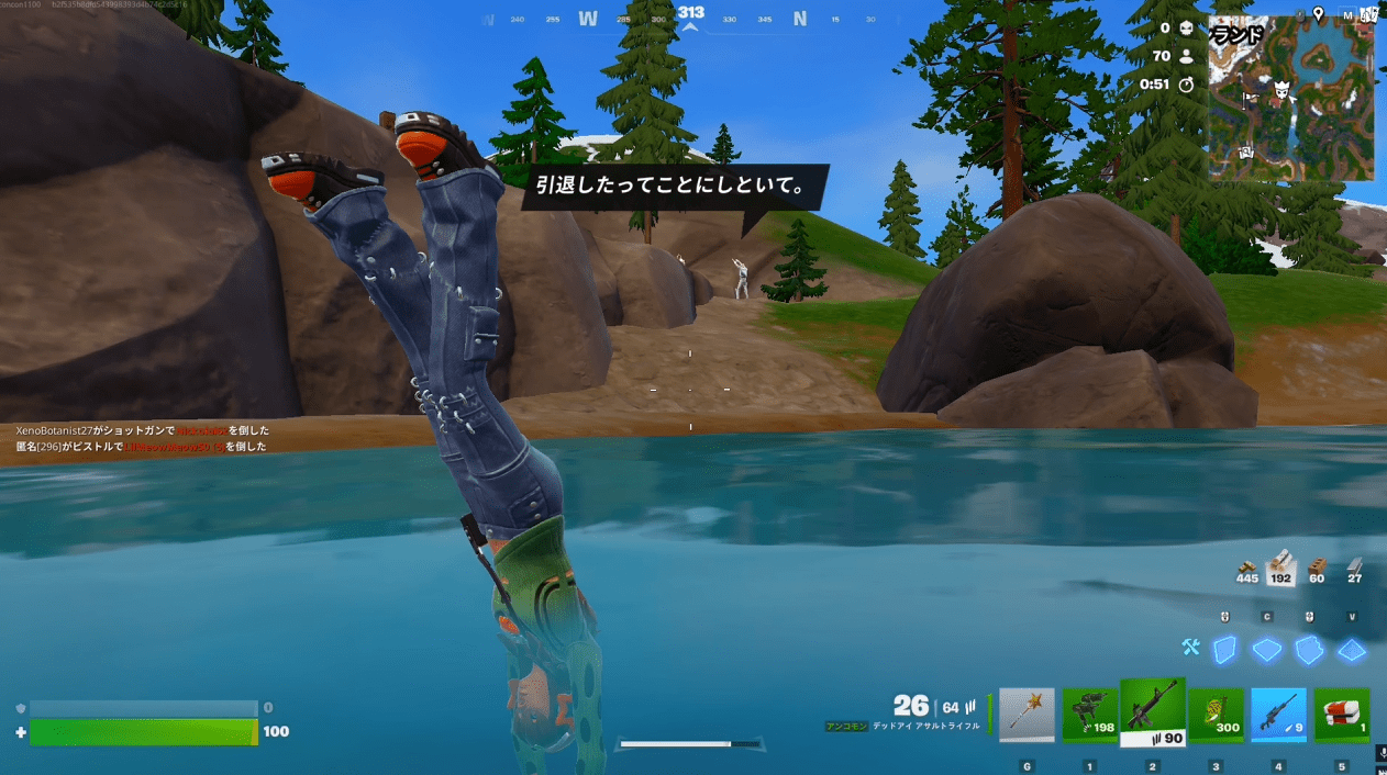 海や川を泳いで10秒以内に敵に攻撃を当てます。
