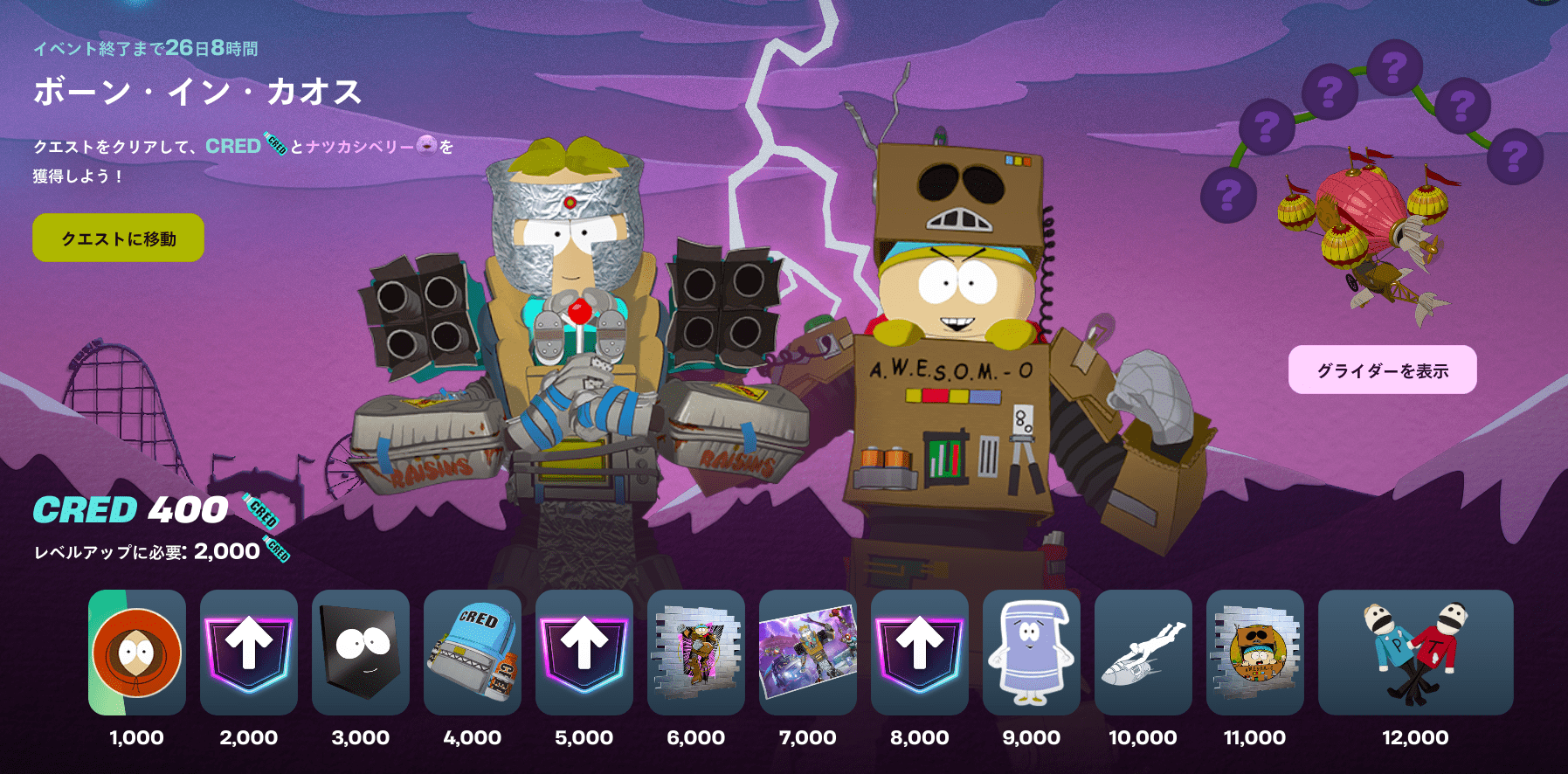 報酬はクエスト1つクリアごとに【400CRED】獲得できます。