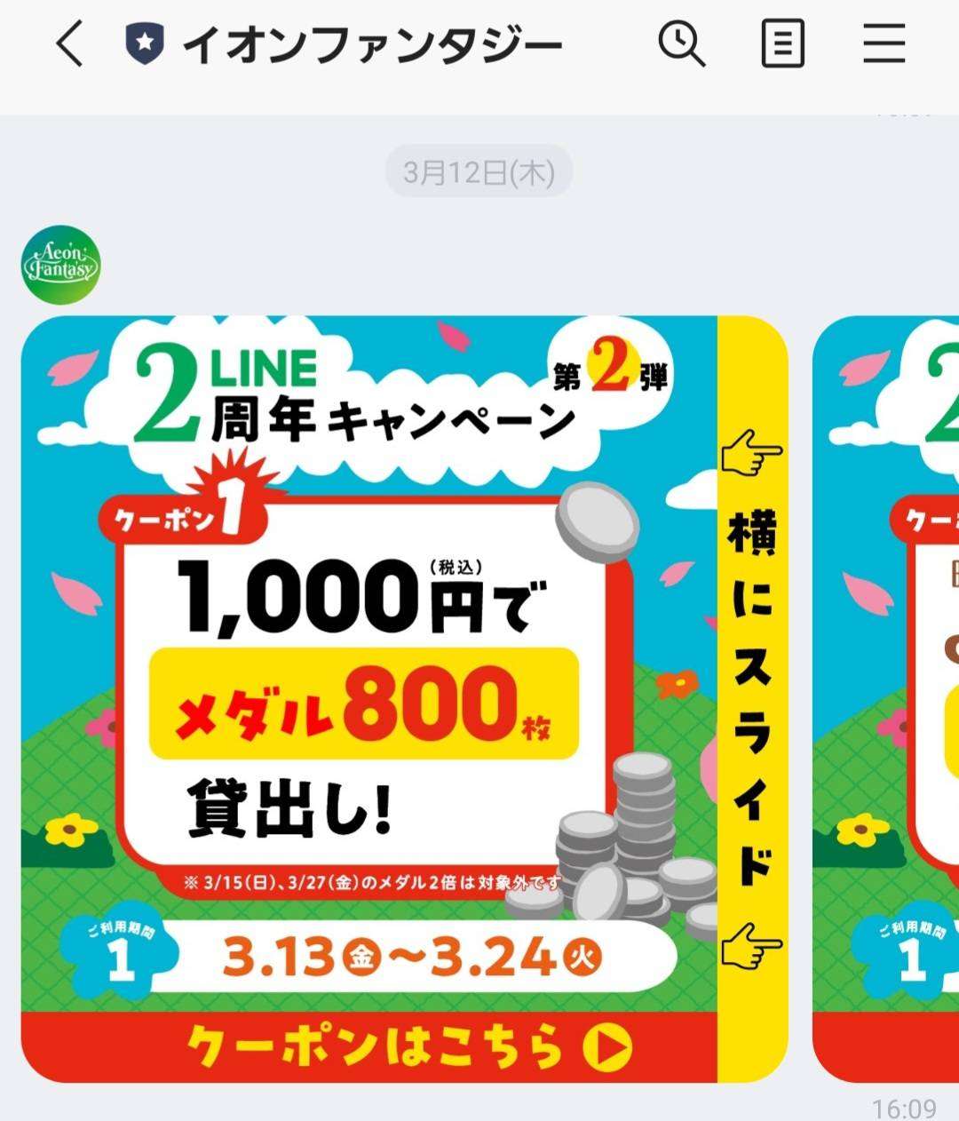 LINEクーポン利用で1000円→800枚のメダル貸出
