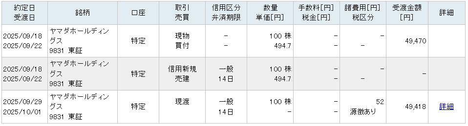 2025年9月は26日が利権付き最終日なのでもう少しギリギリになってからのほうが手数料が抑えられるのはわかっていたのですが、初めてということで色々心配なのでできるときにやっておこうと思い9/18に信用売り&現物買いを済ませました。